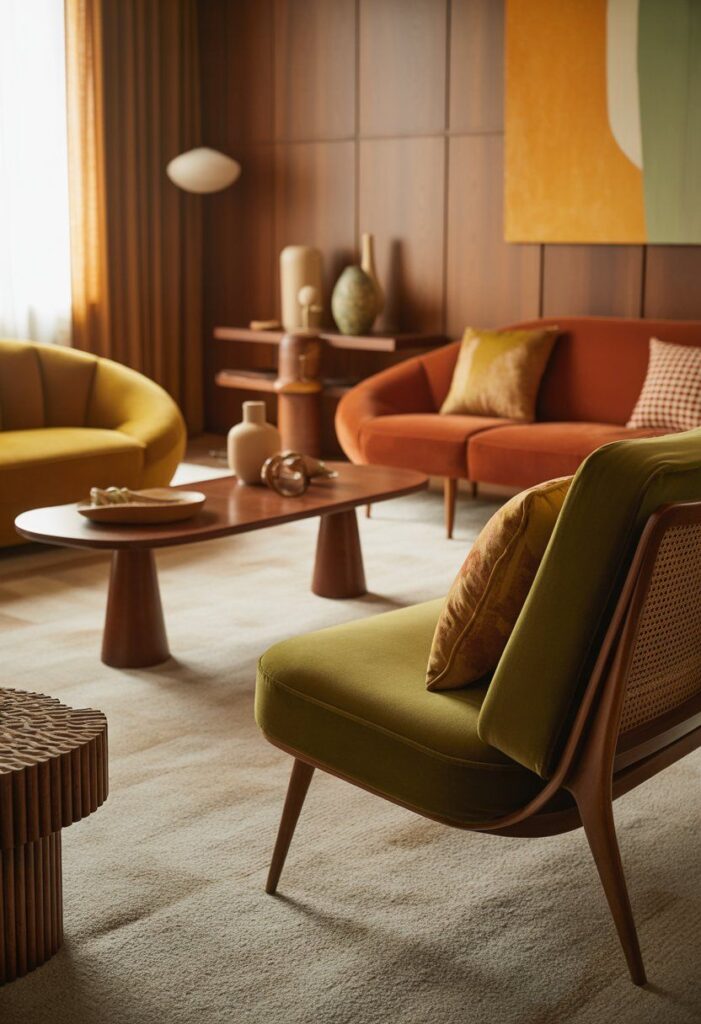 Designers apostam em maximalismo acolhedor, madeira, cores e móveis curvos para resgatar o espírito retrô nas casas contemporâneas.