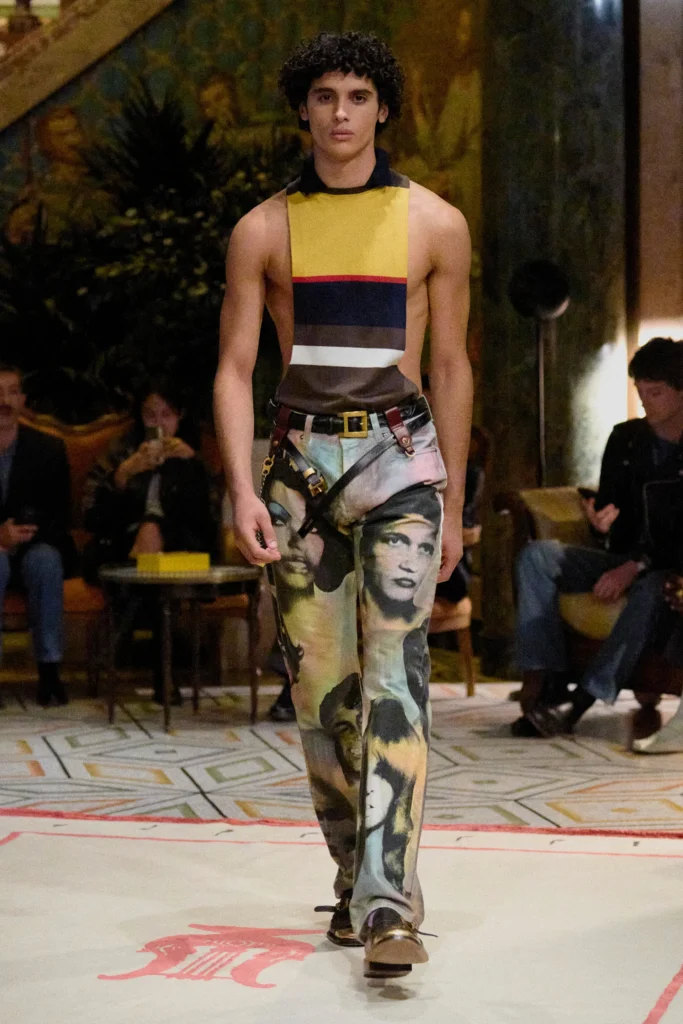 A paleta de cores seguiu vibrante, mas menos estridente, enquanto estampas como listras e paisley trouxeram um ar boho inesperado a peças-chave como coletes estruturados e calças de corte reto. O resultado foi uma estreia que sinaliza novos caminhos para a Versace — moderna, nostálgica e cheia de frescor.