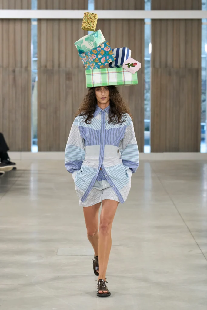 A proposta trouxe à passarela a transformação de materiais simples em criações sofisticadas, carregadas de humor e ironia. Vestidos feitos de retalhos, casacos montados com amostras de tecido e looks que remetiam a sacos de batata ilustraram a estética inusitada da coleção.