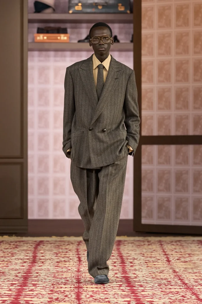 Sartori apresenta uma proposta mais comedida e realista, inspirada em um terno de lã de 1930 do acervo da marca. O resultado é um guarda-roupa refinado, de silhuetas slim e padronagens discretas, feito para a vida real, mas com o acabamento impecável que consagra a casa.