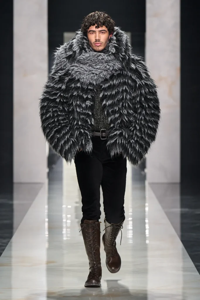 A alfaiataria clássica se destacou com ternos de abotoamento duplo, gravatas e broches que complementaram os looks mais formais. Por outro lado, casacos de pele, jaquetas de couro, golas largas e conjuntos esportivos trouxeram conforto e estilo casual, complementados pelas clássicas estampas da marca, como o animal print, com destaque para o poá.
