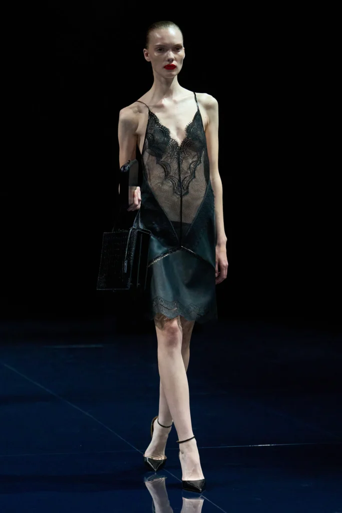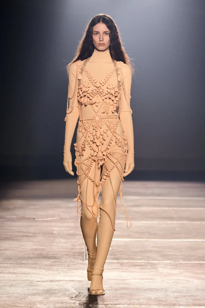 Vestidos alongados e transparentes, decotes acolchoados e franjas discretas reforçaram a proposta de sensualidade velada, saudável e nada óbvia. Foi um início promissor, que sinaliza um novo caminho para a Mugler: menos show, mais essência.