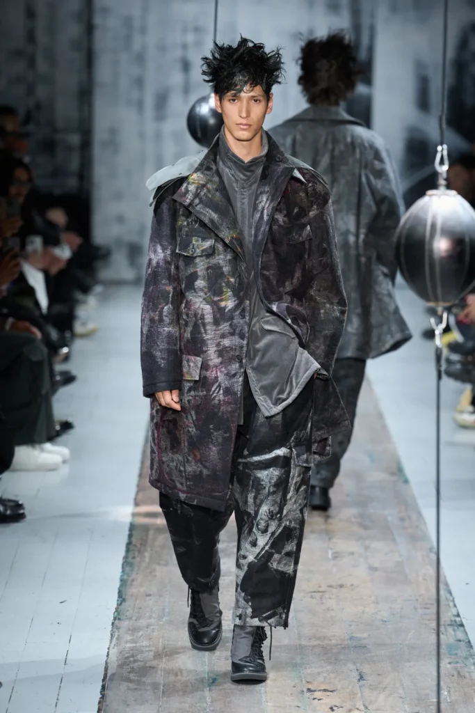 A passarela virou um ritual simbólico, com sacos de boxe suspensos onde modelos interagiam com gestos de carinho e agressividade, simbolizando resistência e emoção. Destaque para os casacos dramáticos em tecidos brutos tingidos como colagens cubistas.