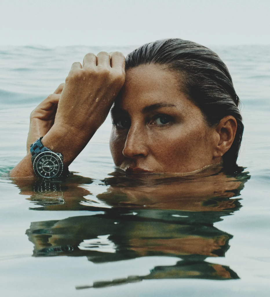Desta vez, o Chanel J12 lança campanha com Gisele Bündchen como protagonista de uma nova fase. A proposta conecta o relógio ao elemento que sempre o inspirou: a água.