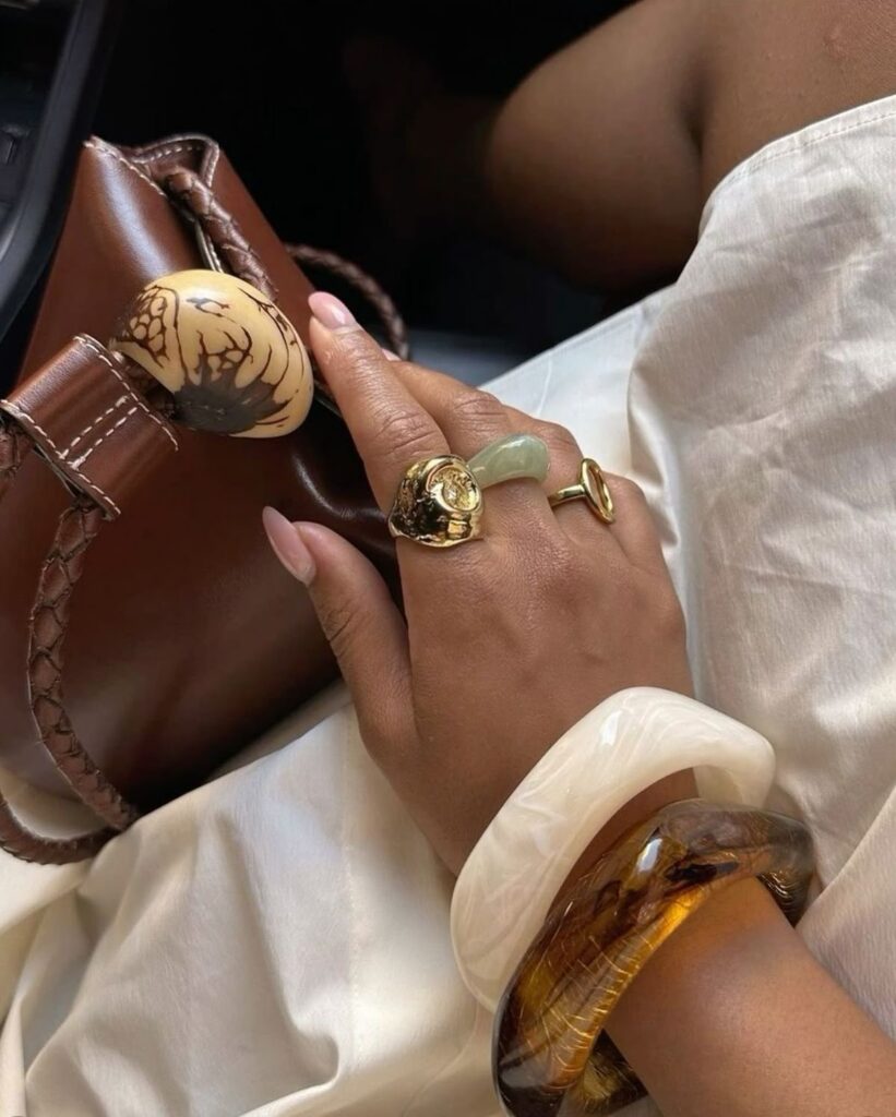 - Harmonia de Cores: Para que os anéis não “briguem” visualmente, é importante considerar as cores. Anéis com pedras podem ser combinados de acordo com a paleta de cores do seu look. Para quem gosta de misturar metais, vale investir em um acessório que amarre as cores, como uma pulseira que contenha tanto prata quanto dourado.