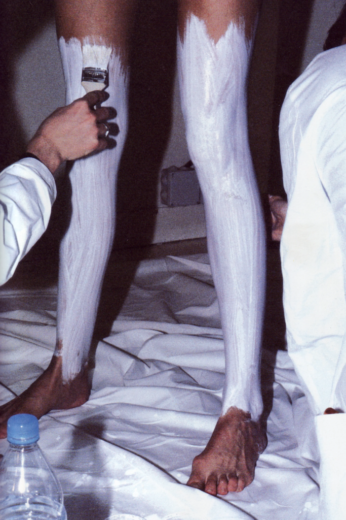 Em Shenzhen, a proposta é participativa. Durante dois dias, o público pode levar roupas próprias e transformá-las com tinta branca, em referência a um gesto que acompanha a casa desde 1988: apagar para reescrever.