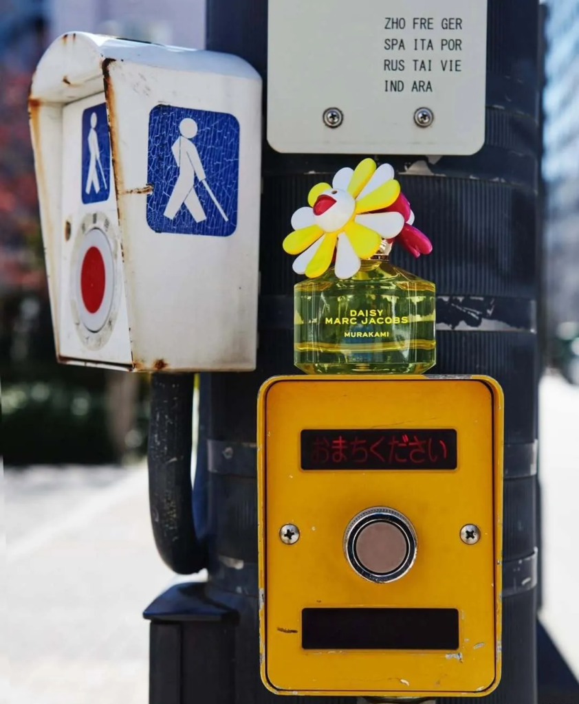 A colaboração entre Marc Jacobs e Takashi Murakami transforma frascos de perfume Daisy em peças colecionáveis. Cores vibrantes, embalagens artísticas e ativações interativas posicionam a fragrância como objeto cultural, não apenas como produto de consumo.