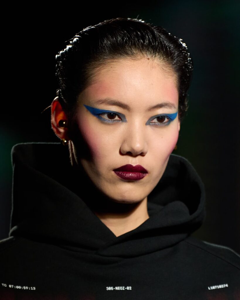 Os olhos dramáticos continuam fortes, mas com uma nova abordagem. O esfumado pesado ainda aparece, assim como o delineado marcante, só que agora tudo vem com um ar menos polido.