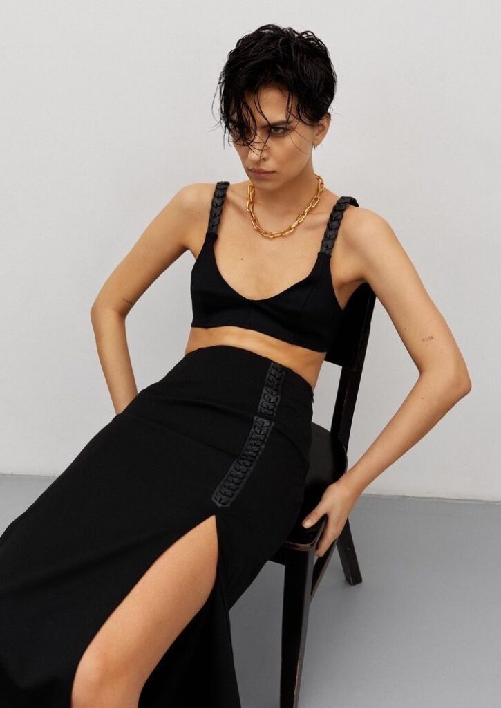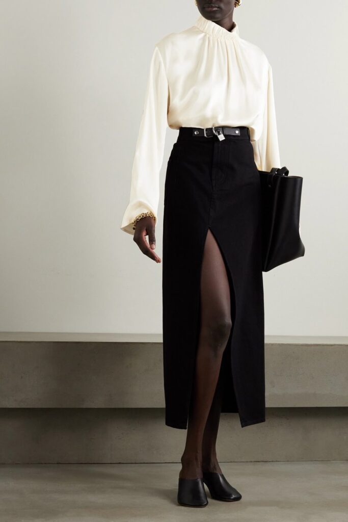 Outra dica importante é equilibrar as proporções. Se a parte de baixo tem fenda, escolha uma blusa com corte mais reto ou feita de um tecido estruturado. Isso cria harmonia no visual e evita que o look fique com muita informação.