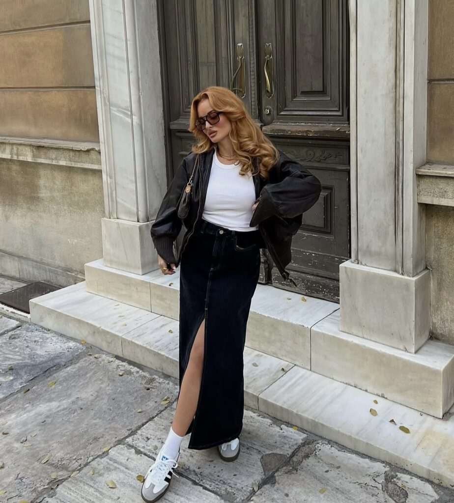 Já nas ruas, o street style tratou de dar um toque urbano à trend. As fashionistas estão combinando saias fendadas com camisetas básicas, botas de cano alto e jaquetas oversized, criando produções despretensiosas, mas com um impacto visual enorme.