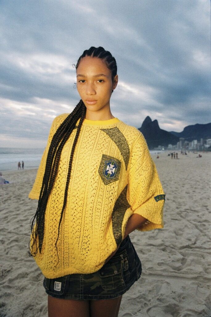 A camisa da Seleção deixou de ser apenas símbolo esportivo para se tornar peça de moda. Reinterpretada por marcas independentes, estilizada com recortes, crochês, aplicações, modelagens cropped e detalhes vintage, ela entrou no radar como item curatorial. Nas ruas, o Brazilcore conversa com a nostalgia Y2K. Tons intensos, colorblocking e acessórios irreverentes reforçam o visual.
