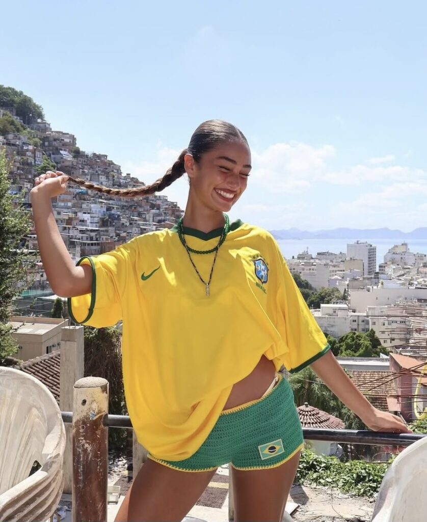 Celebridades como Hailey Bieber, Dua Lipa, Bella Hadid e até Kendall Jenner já aderiram ao visual, incorporando peças com a paleta da bandeira brasileira e elementos inspirados no lifestyle nacional, como camisetas de futebol vintage, estampas tropicais e acessórios coloridos.