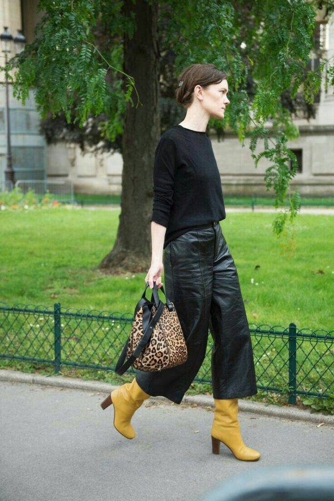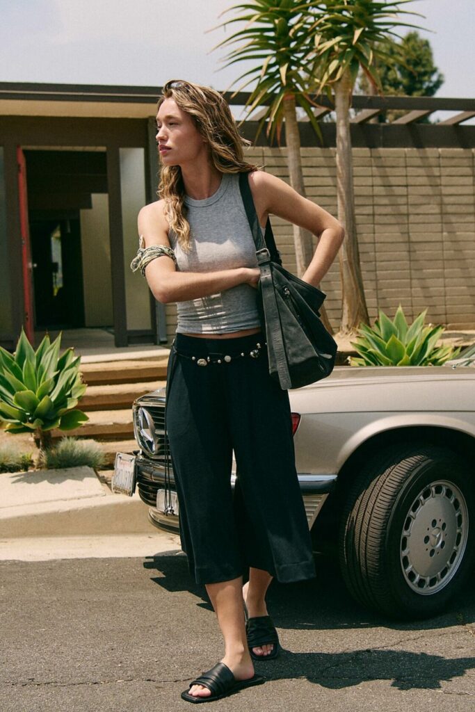 Além disso, vivemos uma fase em que os comprimentos estão mais democráticos. Saia midi, bermuda longa, calça ampla… A calça culotte entra perfeitamente nessa vibe porque mistura o melhor de vários mundos: tem volume, tem movimento, tem estrutura e ainda deixa o tornozelo aparente, o que dá leveza instantânea ao look.