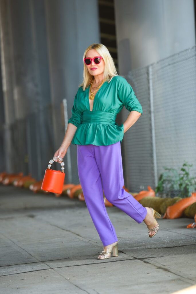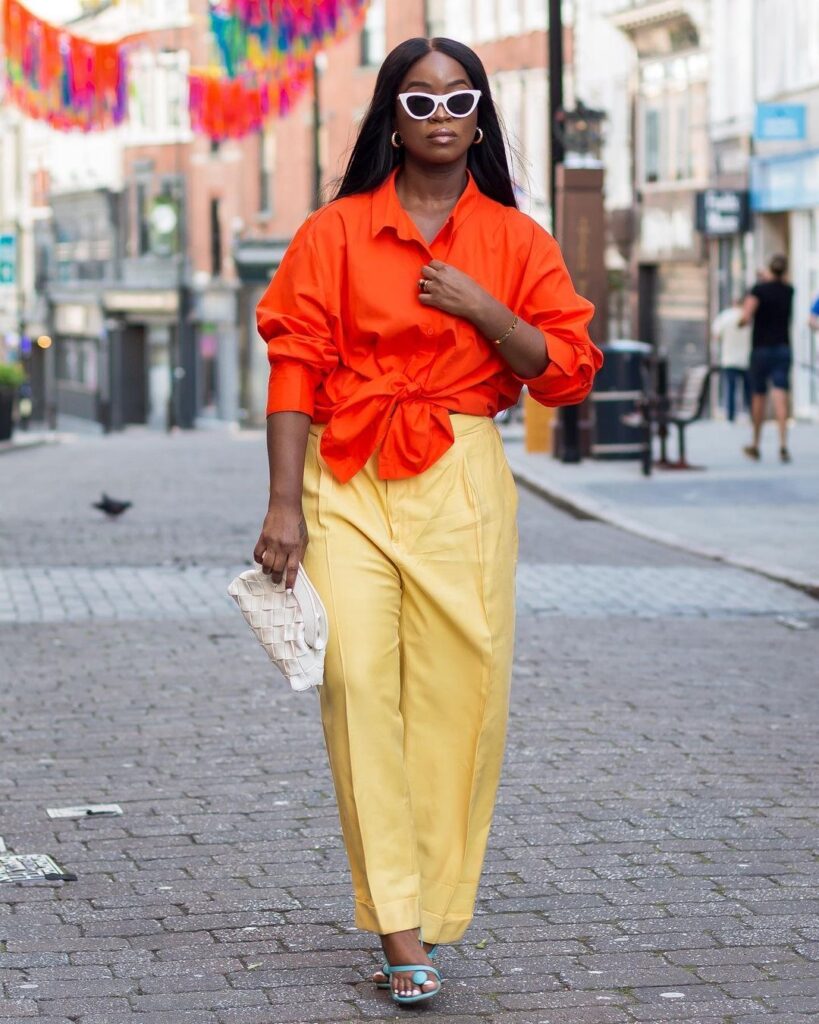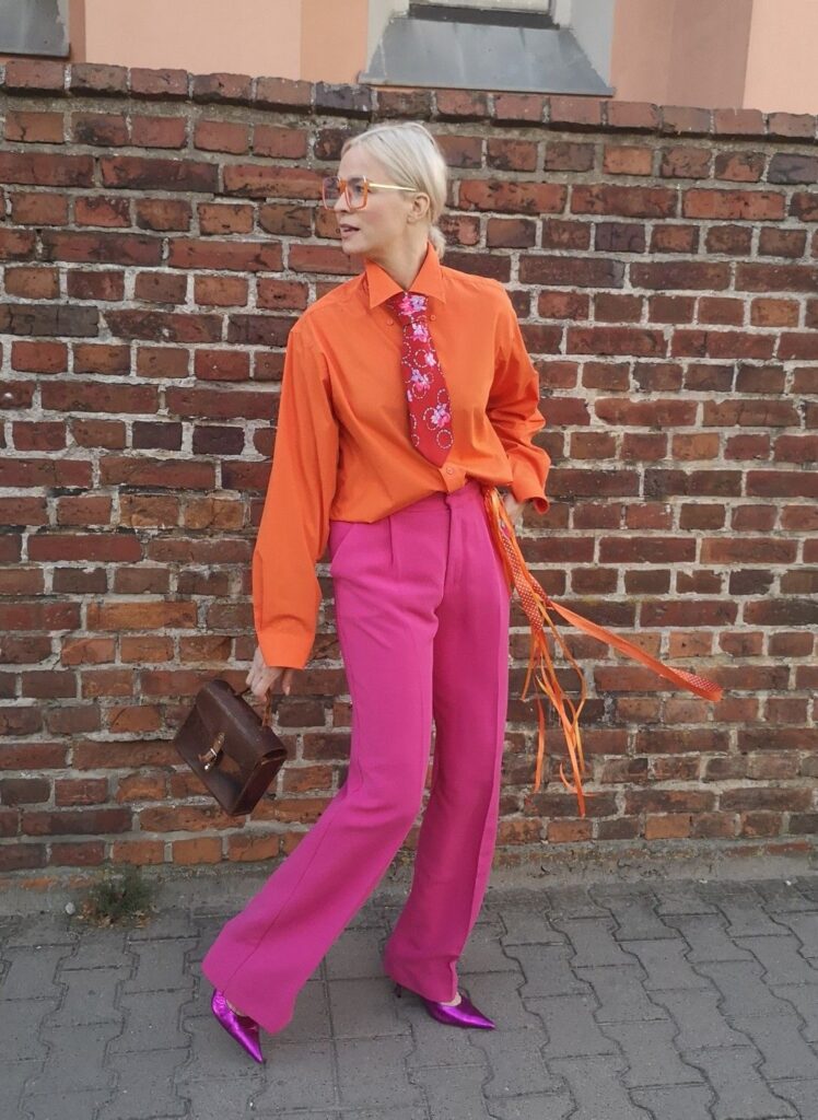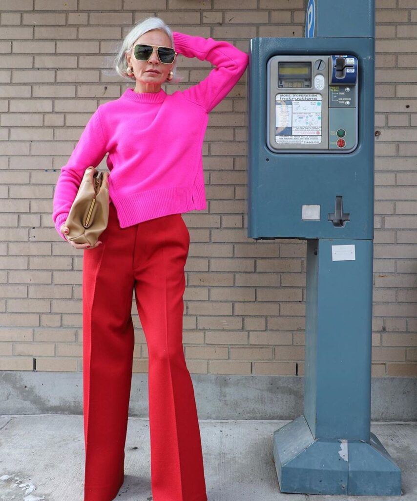 A forma mais simples de entrar no universo do color block é apostar na base neutra com um ponto de cor. É aquela fórmula minimalista que sempre funciona. Pense em uma calça preta com um top cinza e, por cima, um blazer verde vibrante. Ou jeans clássico com camiseta branca e uma bolsa laranja intensa. É uma combinação sofisticada, fácil de montar e perfeita para quem quer experimentar a tendência sem sair demais da zona de conforto.