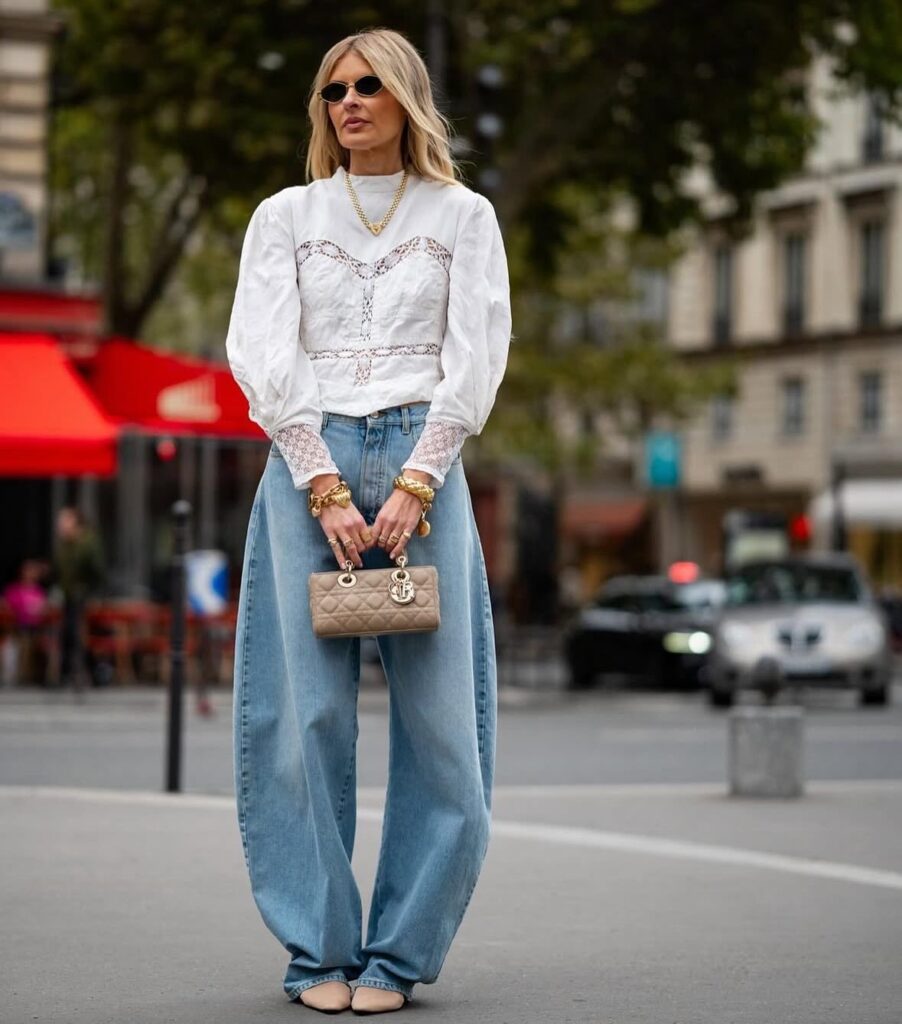 A calça barrel leg continua em alta e segue conquistando espaço. Seu shape arredondado cria uma silhueta diferente, que foge do tradicional e traz um toque contemporâneo ao look.