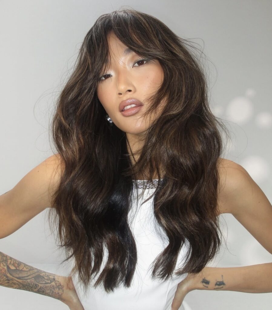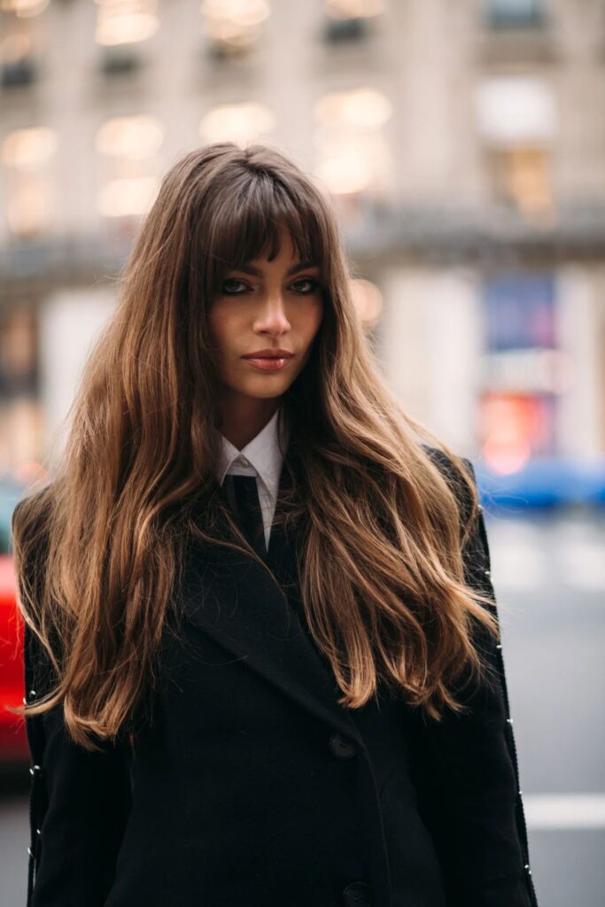 Ao mesmo tempo, cresce o interesse por visuais simples, porém cheios de identidade. A franja setentista entrega personalidade imediata sem exigir manutenção intensa, tornando-se uma escolha equilibrada entre estilo e praticidade, exatamente o tipo de beleza que define a nova era do effortless.