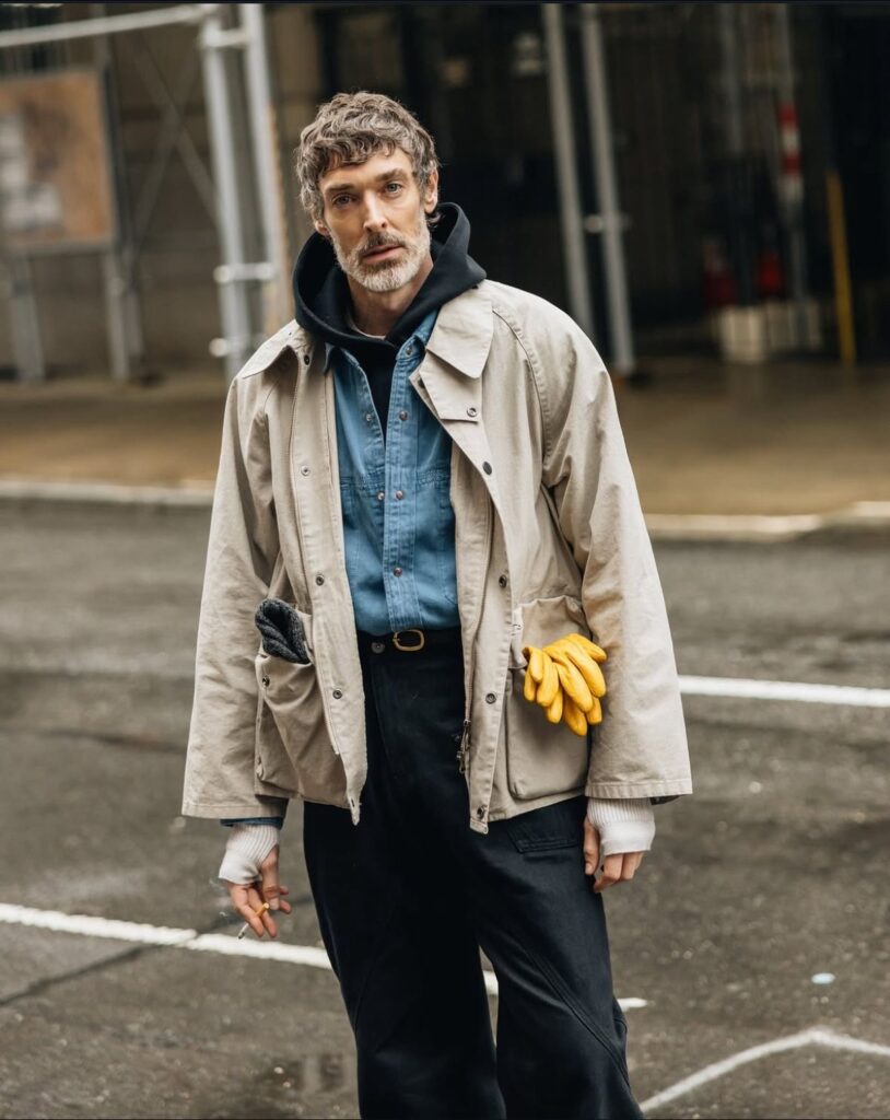 A field jacket também ganha espaço, trazendo uma estética utilitária que dialoga diretamente com o workwear. Com múltiplos bolsos, tecidos resistentes e uma modelagem prática, ela é ideal para sobreposições inteligentes. Ao mesmo tempo, mantém um ar despretensioso, perfeito para quem busca um visual equilibrado entre funcionalidade e estilo.