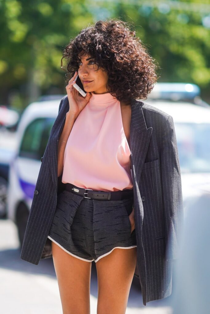 O truque número um para deixar o micro short fashion e moderno é jogar com peças que criem contraste. Um short jeans desfiado, por exemplo, fica superestiloso com blazer oversized ou trench coat. O resultado é aquele visual hi-lo que mistura casual e sofisticado ao mesmo tempo.