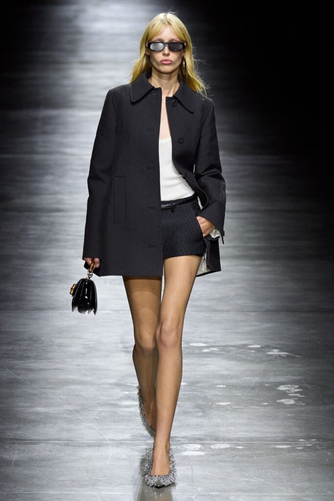 O segredo desse styling é brincar com opostos. Ao invés de usar o micro short em looks óbvios de verão, a proposta agora é combiná-lo com peças sofisticadas e inesperadas. Uma camisa social oversized, um blazer estruturado ou até um trench coat longo criam contraste poderoso com o comprimento curtíssimo.