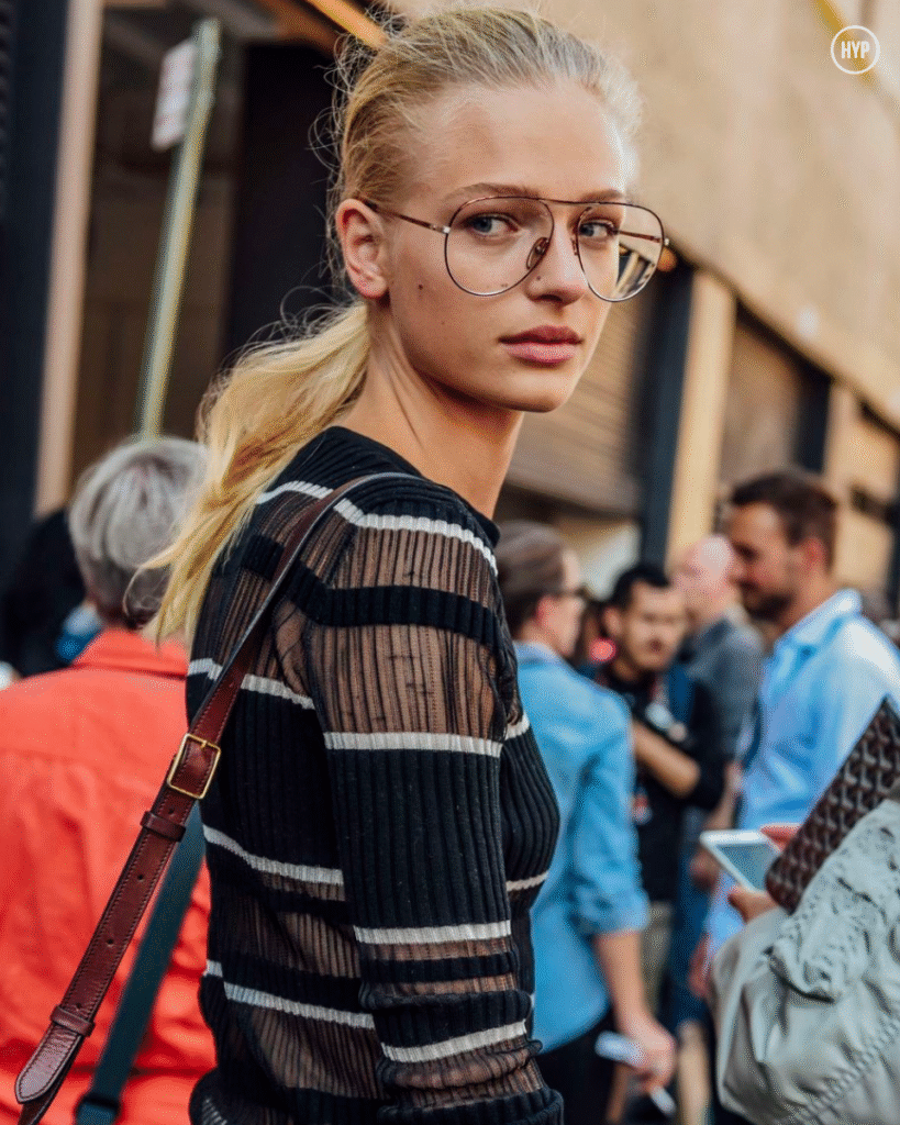 Influenciadoras, criadoras de conteúdo e nomes fortes do street style internacional já adotaram o visual. Armações grandes, transparentes ou em acetato marcante criam um efeito imediato: intelectual, cool e intencional.
