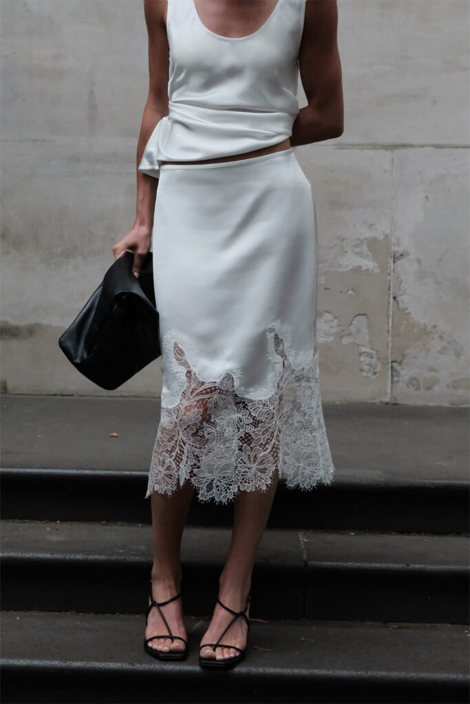 Grande parte do sucesso da saia de cetim está diretamente ligada ao conceito de “hi-lo”, que continua sendo uma das principais apostas do styling contemporâneo. A mistura entre peças sofisticadas e itens mais básicos cria um contraste interessante e atual. Combinar a saia com camisetas oversized, moletons ou suéteres mais amplos, por exemplo, traz uma estética urbana e cool. Nos pés, tênis garantem um ar despojado, enquanto botas ou sandálias elevam a produção, permitindo múltiplas possibilidades dentro de um mesmo guarda-roupa.