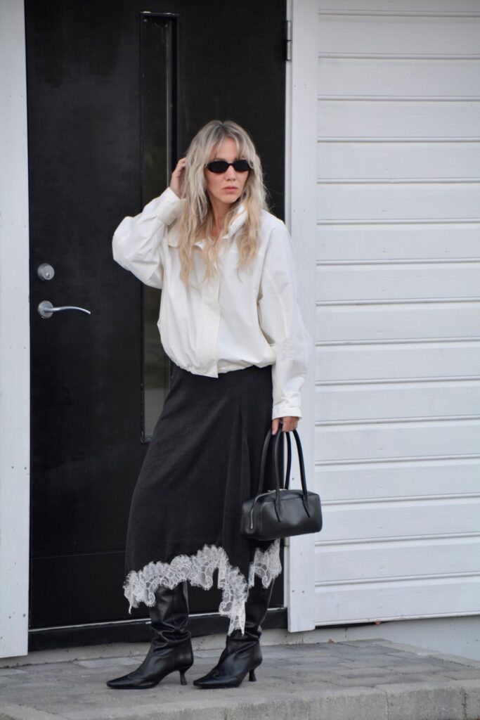 Se a ideia for um look mais arrumado, mas ainda moderno, vale investir no contraste de proporções. Combine a saia de cetim com tricôs, moletons ou suéteres mais amplos. Essa mistura cria um efeito interessante entre o leve e o estruturado, além de ser perfeita para dias mais frios. Botas — de cano curto ou longo — completam a produção com personalidade.