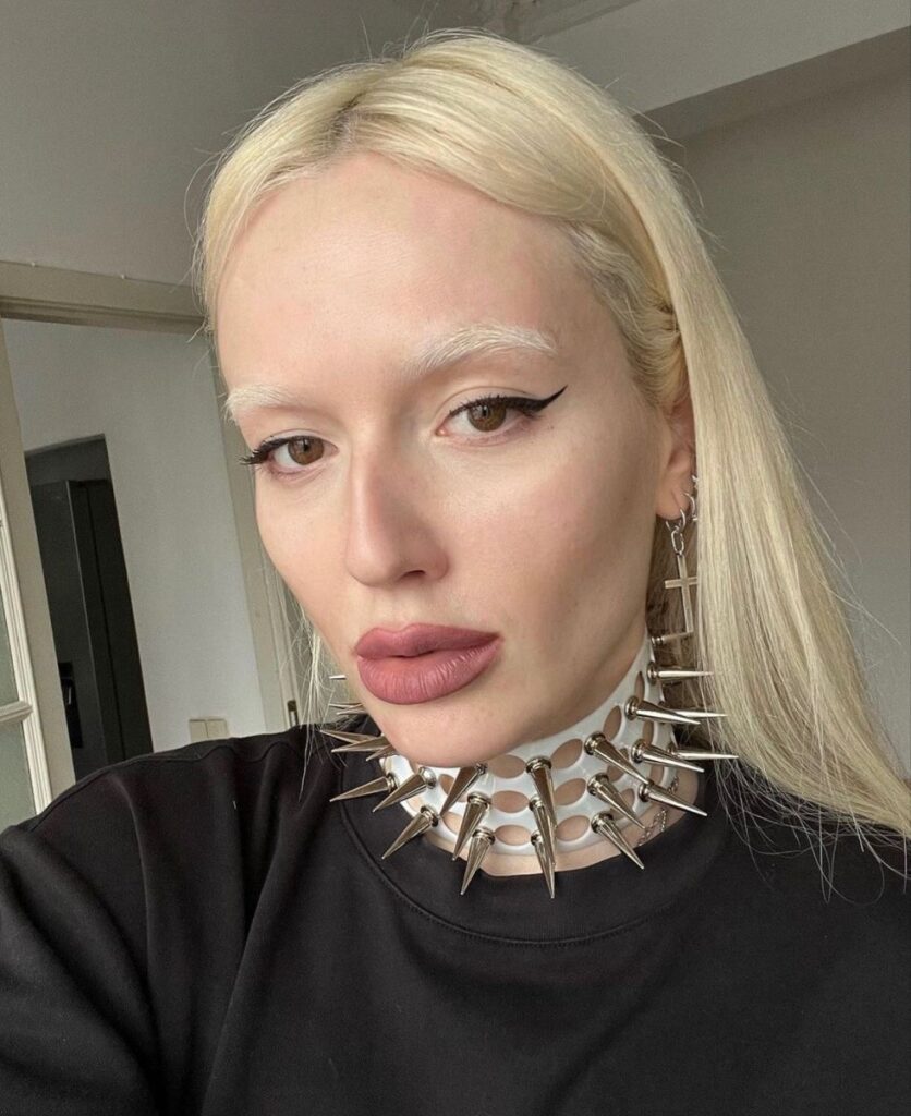 A ideia é simples: clarear os fios até eles praticamente desaparecerem no rosto. O resultado? Um visual misterioso, futurista e ousado, que brinca com a estética do “estranho bonito”, e que já conquistou nomes como Kendall Jenner, Julia Fox e até Lizzo.