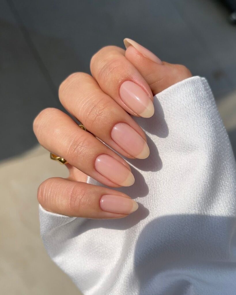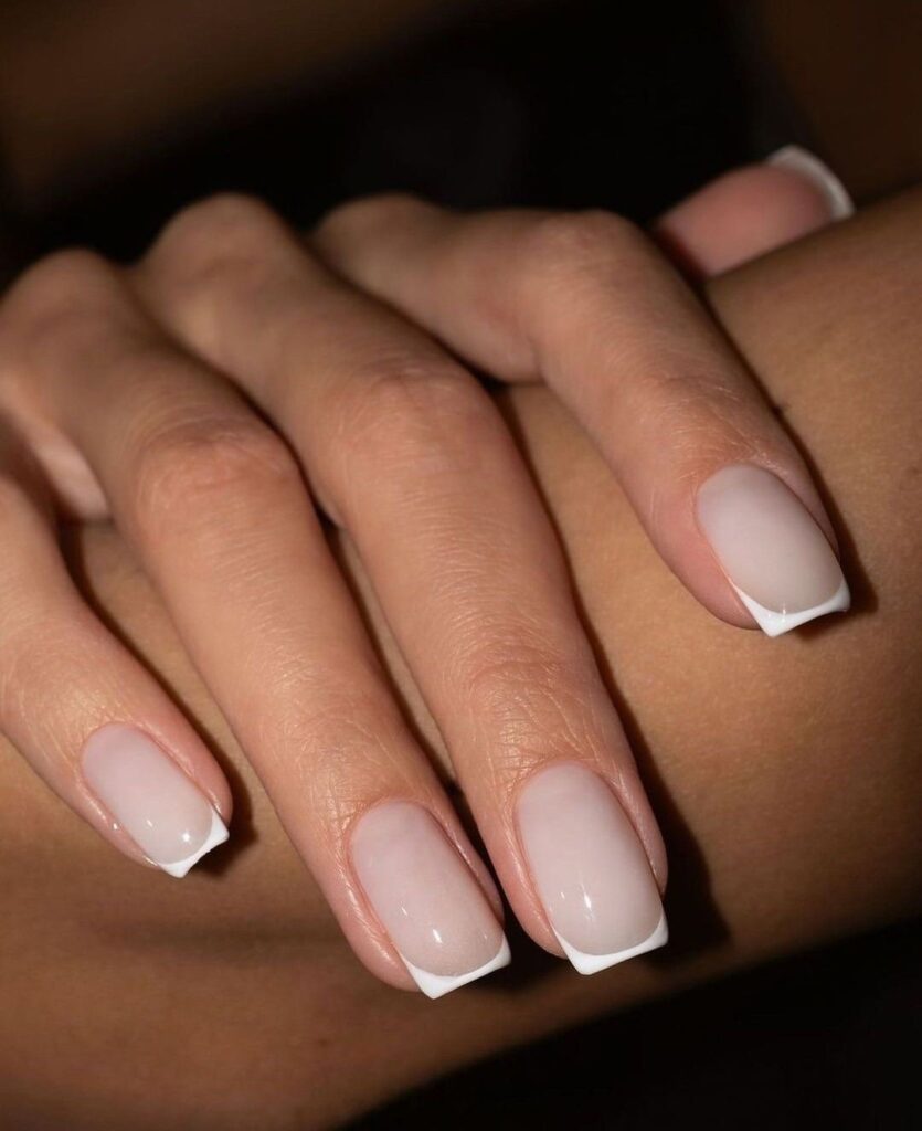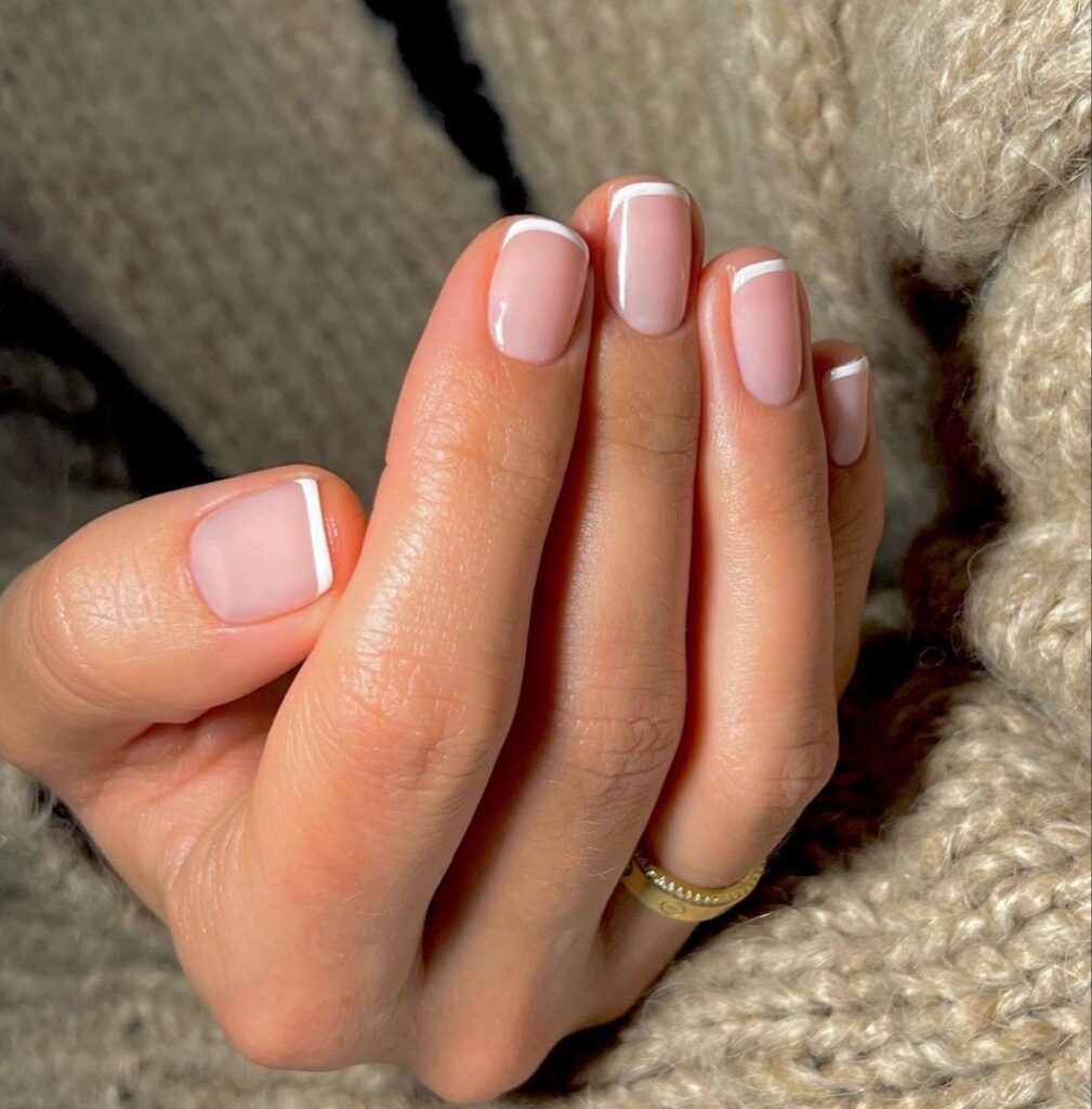 O clássico reaparece em versão delicada, com ponta branca suave, destacando a base natural da unha.