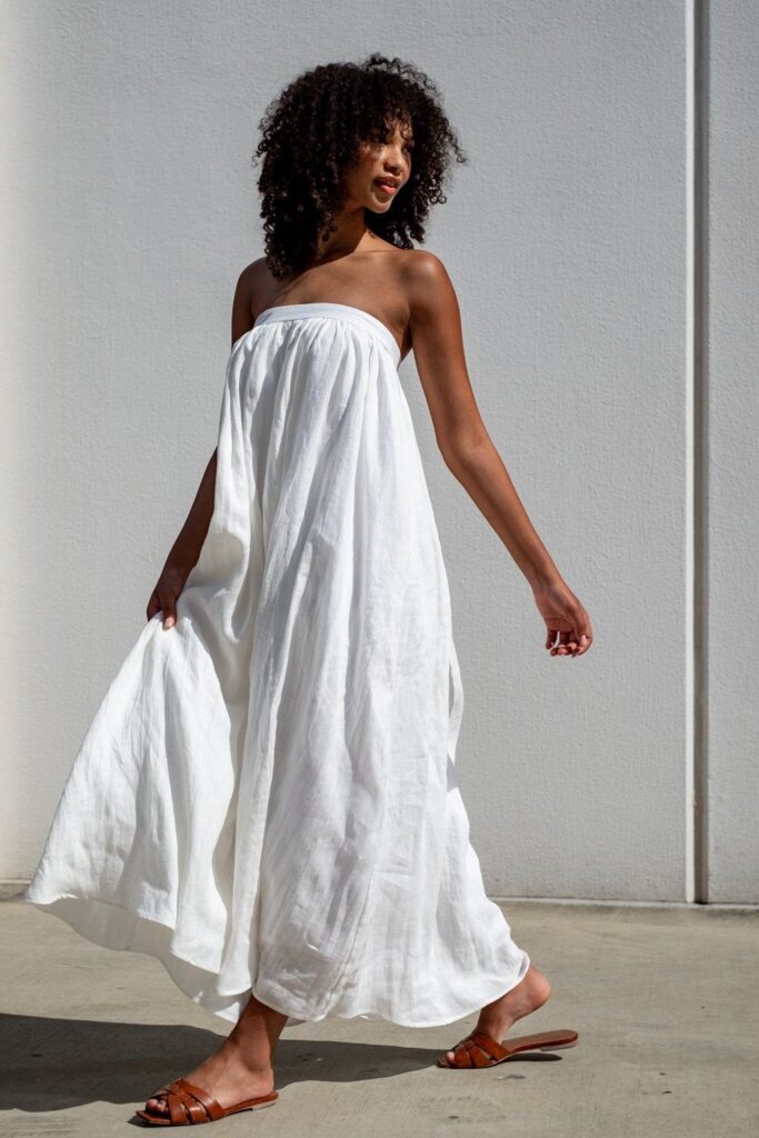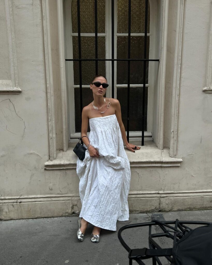 Vestido sem alça no streetwear: A peça aparece combinada a tênis flat, flip flops ou papetes. O resultado é um visual clean, fresco e propositalmente despretensioso. Ideal para dias de altas temperaturas e para quem busca um código estético moderno, mas funcional.