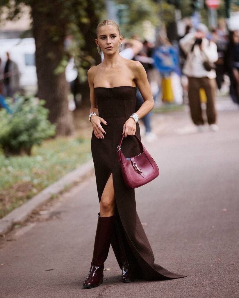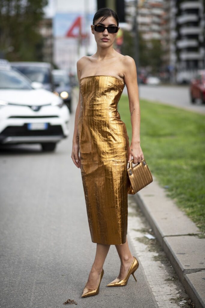 Versões sofisticadas para a noite: Com sandálias de tiras finas, botas de cano curto ou acessórios maximalistas, o vestido ganha um mood glamouroso sem esforço. O brilho acetinado e as superfícies polidas reforçam essa estética.